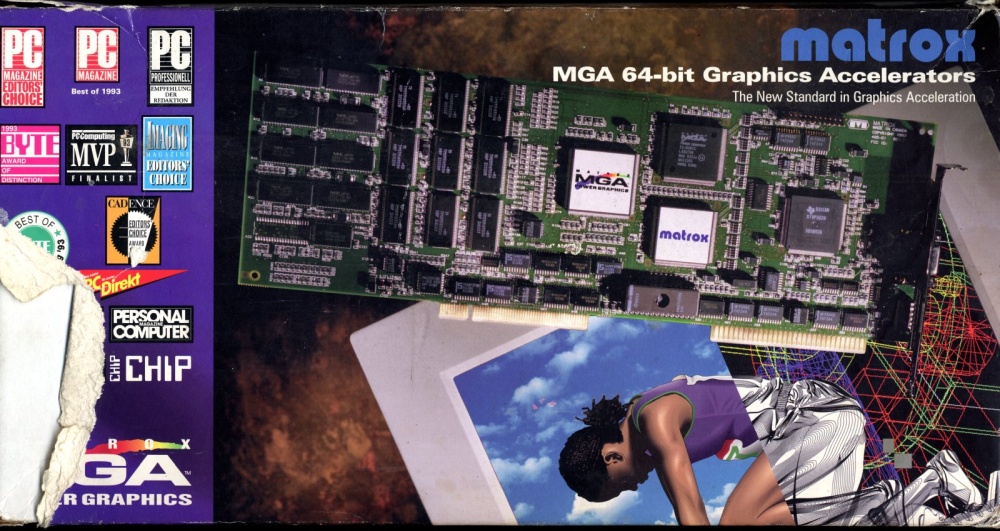 They were probably most famous for their MGA (Matrox Graphics Architecture) engine, launched in May 1993, which was a 64-bit engine that produced superior 2D graphics (important during the era of CRTs) and also had a reputation for being high performers. Similar to ATI's Mach32 and S3's 86Cxxx family of chipsets, MGA accelerated common graphics functions such as BitBlts (bit block transfers) and pattern, polygon, and rectangle fills. It went one better though, and also provided acceleration for 3D Gouraud shading, z-buffering, and character drawing. It was optimised for 486- and Pentium-class computers and was designed with PCI in mind, with its 128-bit bus: 64-bit for graphics (twice as wide as most existing graphics accelerators at the time) and 64-bit for video output. There was also an NTSC/PAL encoder daughterboard called VideoPro that could be installed on MGA cards to provide broadcast-quality TV video output to your desktop.