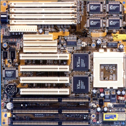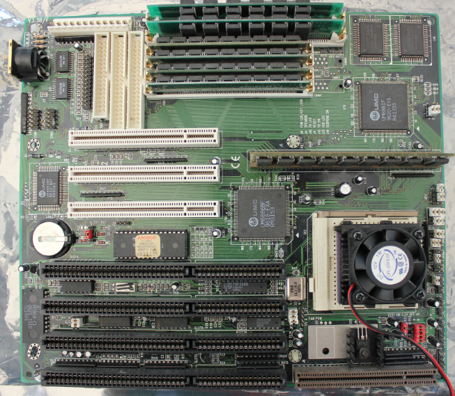 Despite the fact this board has the highly publicised fake cache chips (see top-right corner), it's still an interesting one in that it has a combination of ISA, VESA Local Bus, and PCI slots. There is an argument that combining VLB and PCI on the same board is a bad design choice due to the differences in frequency that are supported between these two standards. Some have noticed the presence of VLB slots on boards like this slows down the PCI slots to avoid incompatibility.