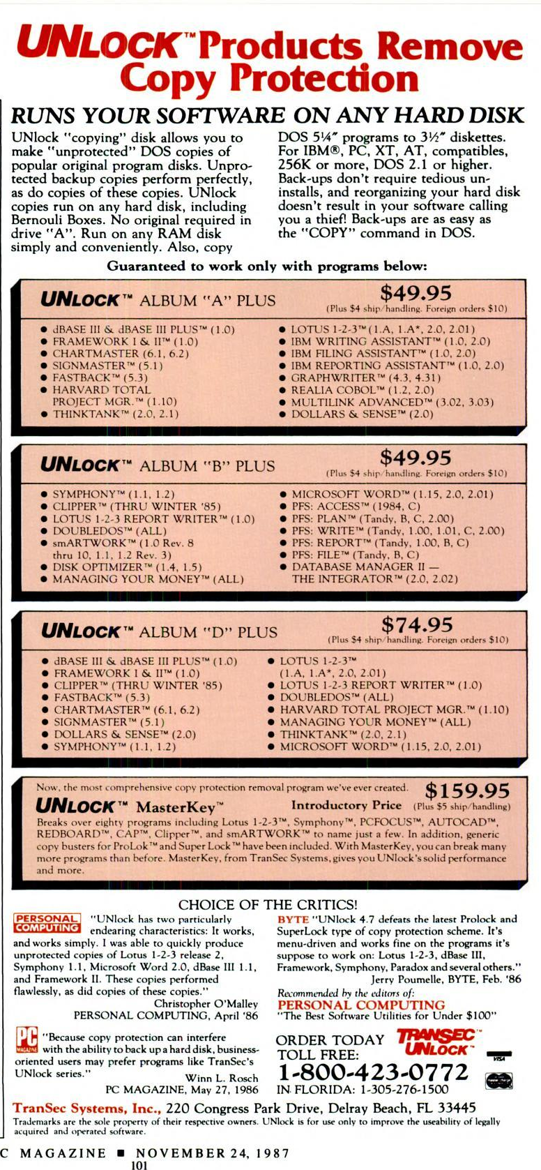 CopyWrite, written by Quaid Software, was another group of utilities that outwit copy protection schemes. It's made up of the main utility CopyWrite, which can be used to reproduce copy-protected diskettes in full, UnGuard removes copy protection from the programs (mostly those protected with SUPERlok), and three more for use with more difficult copy protection: ZeroDisk, RamKey and SoloBoot. These allow you to run programs without using a key disk and are memory-resident.