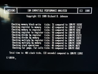 Now to swap out the 32 Mhz crystal for the 40 MHz one (so the CPU will be run at 20 MHz), and revert the BIOS settings back to their default of 1 wait state, these were the results: