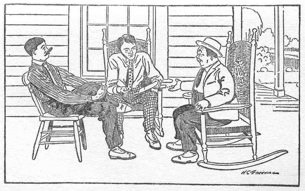 "I wanted a partner, so Andy and me agreed to go out together. I told him about the situation in Fisher Hill and how finances was low on account of the local mixture of politics and jalap. Andy had just got in on the train that morning. He was pretty low himself, and was going to canvass the whole town for a few dollars to build a new battleship by popular subscription at Eureka Springs. So we went out and sat on the porch and talked it over.