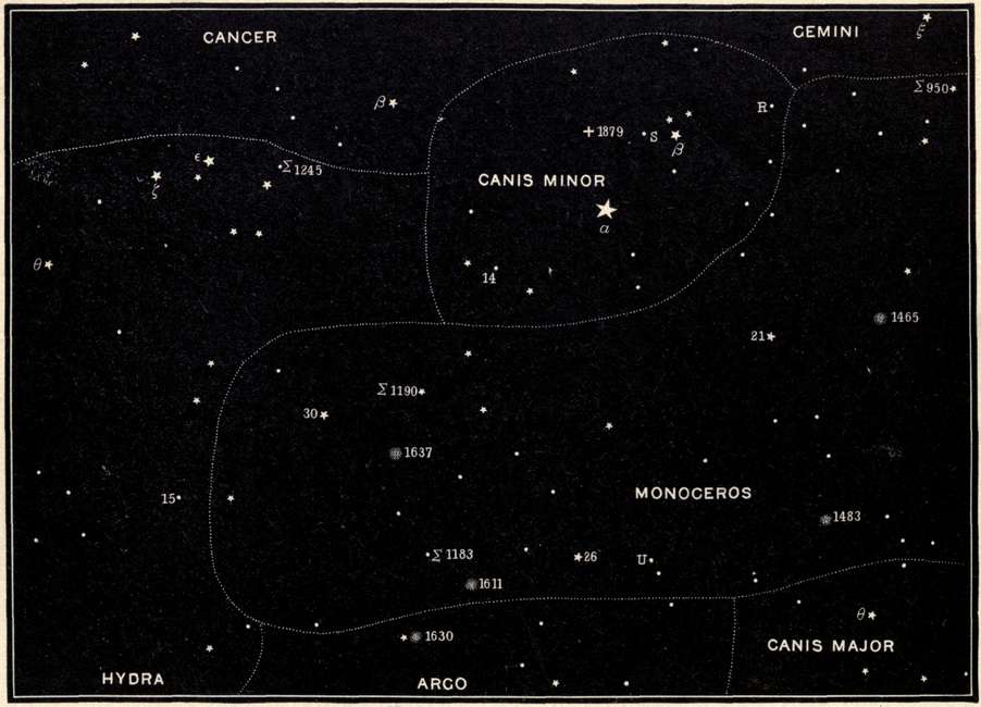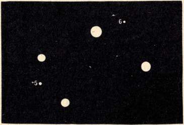 Still retaining the five-inch in use, we may next turn to the other end of the Belt, where, just under ζ, we perceive the fourth-magnitude star σ. He must be a person of indifferent mind who, after looking with unassisted eyes at the modest glimmering of this little star, can see it as the telescope reveals it without a thrill of wonder and a cry of pleasure. The glass, as by a touch of magic, changes it from one into eight or ten stars. There are two quadruple sets three and a half minutes of arc apart. The first set exhibits a variety of beautiful colors. The [Pg 25] largest star, of fourth magnitude, is pale gray; the second in rank, seventh magnitude, distance 42", p. 61°, presents a singular red, "grape-red" Webb calls it; the third, eighth magnitude, distance 12", p. 84°, is blue; and the fourth, eleventh magnitude, distance 12", p. 236°, is apparently white. Burnham has doubled the fourth-magnitude star, distance 0.23". The second group of four stars consists of three of the eighth to ninth magnitude, arranged in a minute triangle with a much fainter star near them. Between the two quadruple sets careful gazing reveals two other very faint stars. While the five-inch gives a more satisfactory view of this wonderful multiple star than any smaller telescope can do, the four-inch and even the three-inch would have shown it to us as a very beautiful object. However we look at them, there is an appearance of association among these stars, shining with their contrasted colors and their various degrees of brilliance, which is significant of the diversity of conditions and circumstances under which the suns and worlds beyond the solar walk exist.