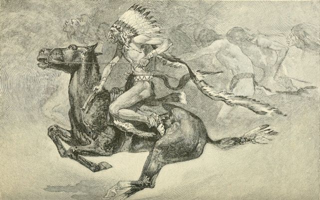 Suddenly a hideously-painted naked man on horseback chased the little boys, leaving the cavalcade, and circling around the children. He rode back into the ranks, and still they loitered in the way. Then around swept the horsemen once more, and this time the naked rider flung himself from his horse, and seizing one boy and then the other, bore each to the ground, and made as if he would brain them with his hatchet and lift their scalps with his knife. The sight was one to paralyze an on-looker. But it was only a theatrical performance arranged for the occasion. The man was acting over again the proudest of his achievements. The boys played the parts of two white men whose scalps now grace his tepee and gladden h[51]is memory.
