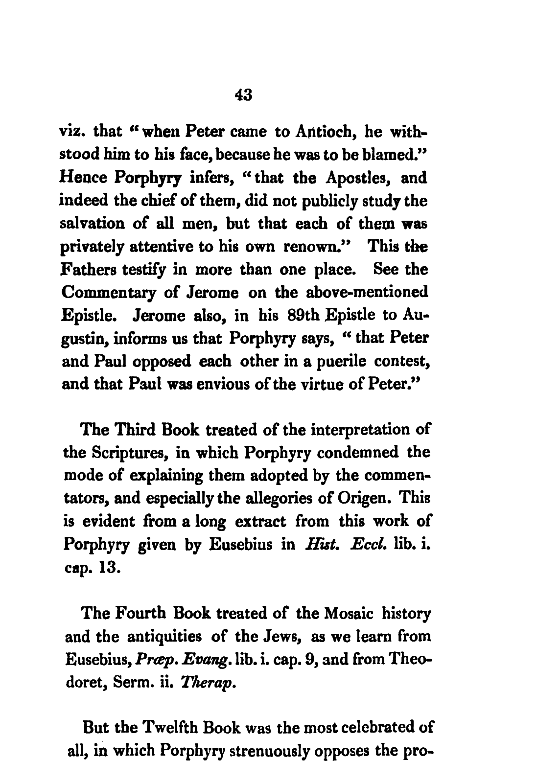 "I HAVE often wished," says Warburton in a letter to Dr. Forster, October 15, 1749, "for a hand capable of collecting all the fragments remaining of Porphyry, Celsus, Hierocles, and Julian, and giving them to us with a just, critical and theological comment, as a defy to infidelity. It is certain we want something more than what their ancient answerers have given us. This would be a very noble work*."