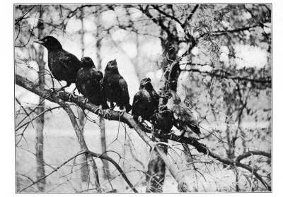As we left the house the thermometer stood at four below, while the sky was of a frozen blue, without a cloud, and had a hard glitter as if streaked with frost. In a low tree by the roadside, we heard the metallic note of a downy woodpecker scurrying up the trunk and backing stiffly down. Farther on sounded a loud cawing, and we saw four ruffianly crows assaulting a respectable female broad-winged hawk. One after the other they would flap over her as closely as possible, aiming vicious pecks as they passed. The broad-winged beat the air frantically with her short, wide, fringed wings, and seemed to make no effort to defend herself against her black, jeering pursuers. Once she alighted on an exposed limb. Instantly the crows settled near her and used language which no respectable female hawk could listen to for a moment. She spread her wings[Pg 26] and soared away, and as she passed out of sight they were still cawing on her trail.