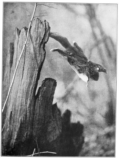 When I came to examine the den, I found that there were three burrows in a line, perhaps fifteen feet in length, with a hard-worn path leading from one to the other. The watch-log behind them was rubbed smooth and shiny, with reddish fox-hairs caught in every crevice. Near the three burrows was a tiny one, which I think was probably dug as an air-hole; while in front I found the feathers of a flicker, a purple grackle, and a chicken, besides the remains of the crow aforesaid. How any fox outside of the fable could beguile a crow is a puzzle to me. All of these burrows were in plain sight, and I hunted a long time to find the concealed one which is a part of the home of every well-regulated fox family. For a while I could find no trace of it. Finally I saw on the side of a stump one reddish hair that gave me a clue. Examining the stump carefully, I found that it was hollow and formed the entrance to the secret exit from the three main burrows.