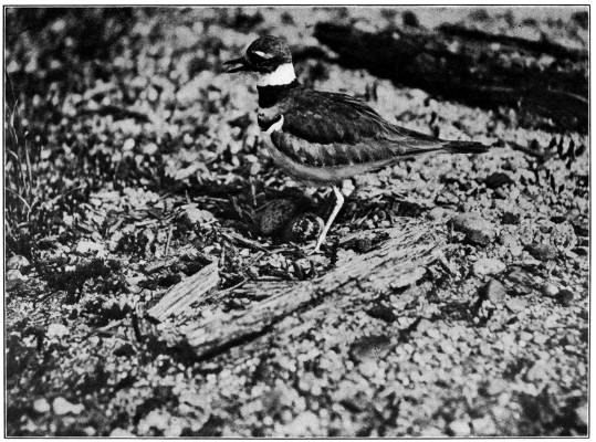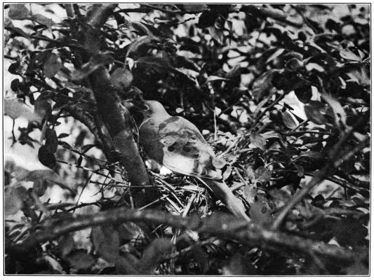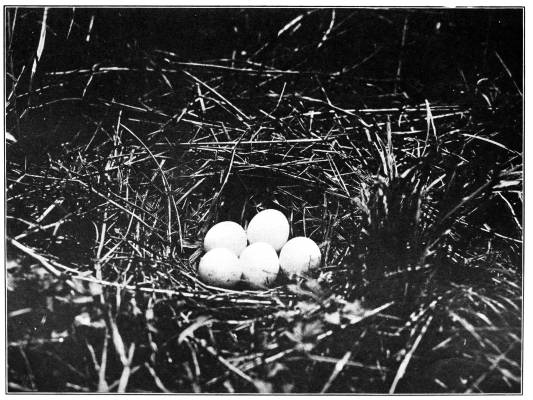 The last nest of all was my treasure nest of the summer. I was about to give up the game and start off for a walk, when suddenly, right ahead of me, hanging on the limb of a sugar-maple, not five feet above the stone wall, I saw the swinging basket-nest of a vireo, with the woven white strips of birch-bark on the outside which all vireos use in that part of the[Pg 13] country. It was as if a veil had suddenly dropped from my eyes, for I had been looking in that direction constantly, without seeing the nest directly in front of me. Probably, at last, I must have slightly turned my head and finally caught the light in a different direction. I supposed that the nest was that of the red-eyed vireo, the only one of the five vireos which would be likely to build in such a location. Climbing upon the wall to look at it, I saw that the mother bird was on the nest. Even when I took hold of the limb, she did not fly. Then I slowly pulled the limb down, and still the brave little bird stayed on her nest, although several times she started to her feet and, ruffling her feathers, made as if to fly. As the nest came nearer and nearer, I could see that she was quivering all over with fear, and that her heart was beating so rapidly as to shake her tiny body. Finally, as she came almost within reach of my outstretched hand, she gave me one long look and then suddenly cuddled down over her dearly loved eggs and hid her head inside of the nest. Reaching my hand out very carefully, I stroked her quivering little back. She raised her head and gave me another long look, as if to make sure whether I meant her any harm. Evidently I seemed friendly, for as I stroked her head she turned and gave my finger a little peck, then snuggled her head up against it in the most confiding, engaging way. As she did so, I noticed that a white line ran from the beak to the eye, and that she had a white eye-ring and a bluish-gray head. As I looked at her, suddenly from[Pg 14] a nearby branch the father bird sang, and I recognized the song of the solitary or blue-headed vireo, who belongs in the deep woods and whose rare nest is usually found in their depths. As the male came nearer, I could see his pure white throat which, with the white line from eye to bill and the greenish-yellow markings on either flank, make good field-marks. The four eggs, which I saw afterwards when the mother bird was off the nest, were white with reddish markings all over instead of being blotched at one end as are those of the red-eyed vireo. Every day for the rest of that week I visited my little friend; and before I left she grew to know me so well that she would not even ruffle up her feathers when I pulled the limb down.