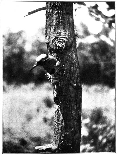 That day the wren-song brought me good luck. It was no more than finished when I heard someone passing along a nearby wood-road, who turned out[Pg 21] to be an early-rising workman from whom I borrowed some matches with which I finally discovered my missing eyes half buried in the snow. I attacked the pignut hickory with great energy to make up for lost time. Little by little the axe bit through the tough wood, until the kerf was well past the heart of the tree. As I chopped I could hear the quick strokes of a far better wood-cutter than I shall ever be. Suddenly he gave a loud, rattling call, and I recognized the hairy woodpecker. He is much larger than the downy, being nearly the size of a robin, while his call is wilder and louder and lacks the downward run of the downy’s note. We chopped on together, he at his tree and I at mine. Suddenly from my tree sounded a warning crack, and the trunk wavered for a moment. I stepped well off to one side, for it is dangerous to stand behind a falling tree. If it strikes anything as it falls the trunk may shoot backward. A venerable ancestor of mine, so the story runs, tried to celebrate his ninetieth birthday by chopping down a tree, and standing behind it, was killed by the back-lash of the falling trunk.