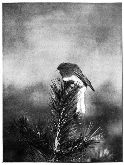 On the way back to breakfast, as the sun came up and warmed a slope of the woods, a flock of slate-colored juncos burst out altogether in a chorus of[Pg 23] soft little trills, with now and then sharp alarm-notes like the clicking of pebbles together, interspersed with tiny half-whispered notes best expressed by the same letters as those used in writing the grosbeak music—“Teu, teu, teu, teu.” Suddenly, from a farther corner of the sun-warmed slope, I heard a few tinkling notes followed by a tantalizing snatch of rich, sweet song shot through with canary-like trills and runs. I hurried over the snow and caught a glimpse of a little flock of birds with crowns of reddish-brown, and each wearing small black spots in the exact centre of their drab-colored waistcoats. They were tree-sparrows down from the far North, and I was fortunate to have heard the peculiarly gentle cadence of one of their rare winter songs.