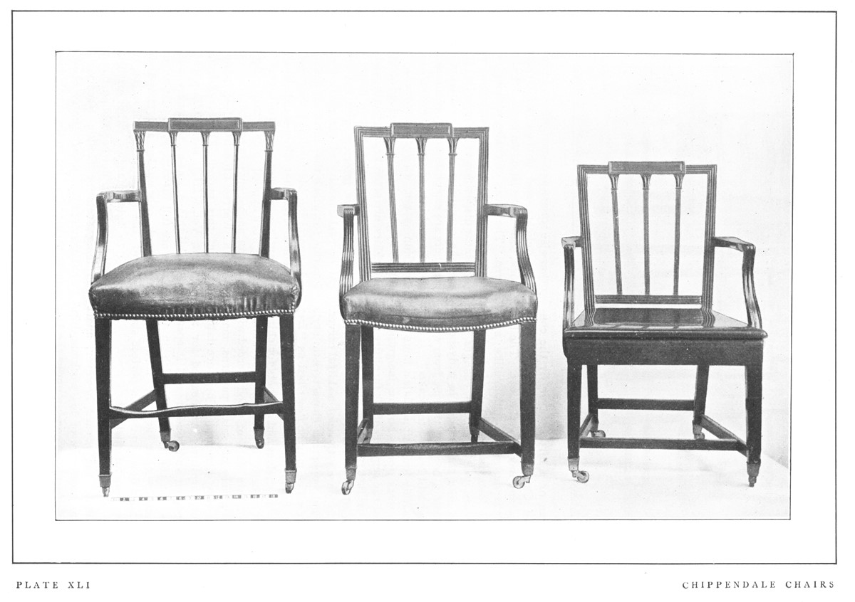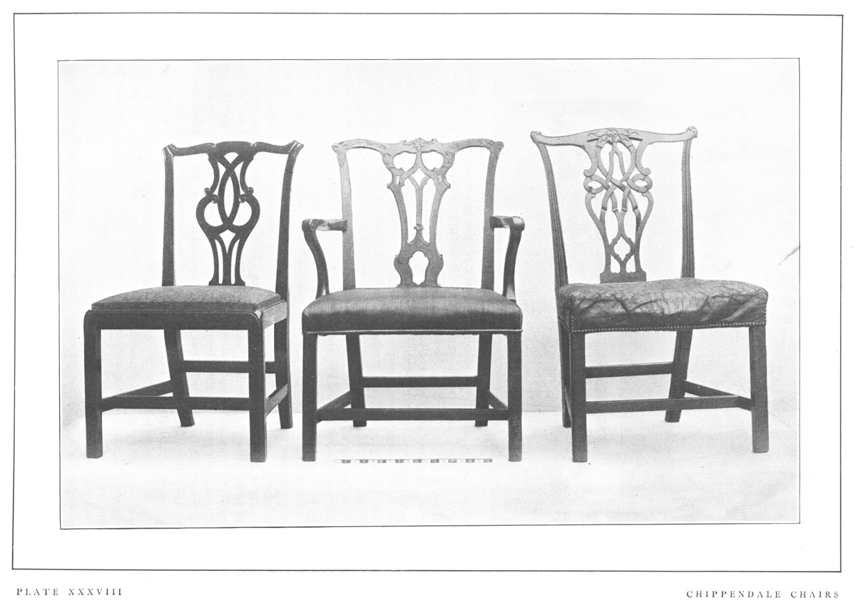 The chairs chosen for illustration in this number are of the simpler patterns. It will be seen that they have very little ornament, and that this is almost entirely confined to the backs, the legs being in most cases square and plain. In the backs the same lines occur as in those made in the time of William III., but instead of the frame of the back being covered with silk, tapestry or other material, Chippendale's are cut open with fanciful patterns. Those with cabriole legs usually have claw feet and a shell or leaf at the top. The chairs in Chippendale's book are much more elaborate than those here illustrated or than those he ordinarily produced. This is naturally accounted for by the desire to induce customers to purchase the more expensive pieces. The simple square leg without taper is one of the distinctive marks of Chippendale's time. Later in the century, in the work of Hepplewhite and others, the legs were made more tapering and the whole chair much lighter and more elaborately ornamented to correspond with the Renaissance forms then in vogue. The turned leg is rarely found, although much used later. The shaping and ornamentation is generally confined to the front legs. Mahogany, as has been stated, was the wood most used, and the ornamentation was confined as a rule to carving. Inlay and marquetry, brass and ormolu were employed on other articles of furniture, but the chairs rarely have such ornament.