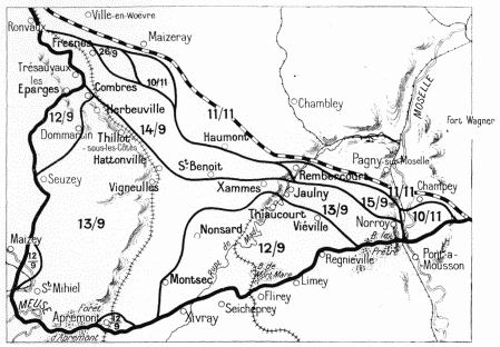 On the 10th, the forts were still holding out, although deluged with shells. Meanwhile the German infantry advanced towards St. Mihiel.