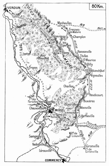 While the Battle of the Marne was raging, the Germans attempted in vain to capture the Meuse Heights, in order to take Gen. Sarrail’s Army—the pivot of Joffre’s manoeuvre—in the rear.