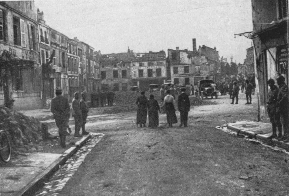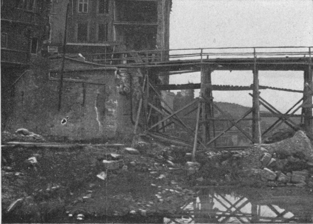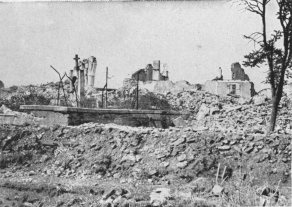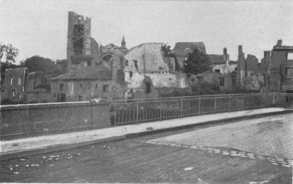 In the background: Temporary foot-bridge built by the Allies in Sept., 1918.