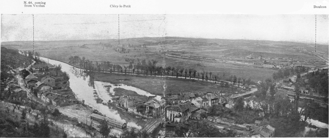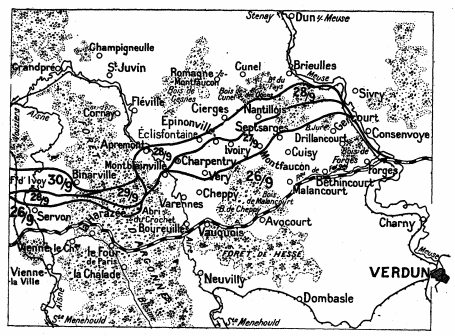 (1) The main road from Varennes to Vienne-le-Château, via the Four-de-Paris, where a road running north-south branches, crossing at Les Islettes, the “National Road,” and the railway from Châlons-sur-Marne to Verdun, via Sainte-Menehould.