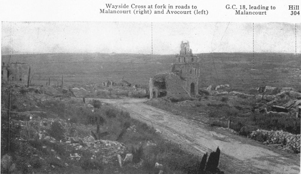 These picturesque spots have often charming names: Bois de la Viergette, Ruisseau des Emerlots, Fontaine la Houyette, Fontaine-aux-Charmes, Fontaine-Madame and Bagatelle. Sometimes the names are quaint: Fille-Morte, Moulin del’Homme Mort, Ferme-la-Mitte, Chêne Tondu and Courte-Chausse. Below the long ridge, which forms, as it were, the backbone of the forest, the Chemin de la Haute-Chevauchée, and, a little further west, the Pavillon St. Hubert evoke memories of bygone hunting-parties. All these names, yesterday but little known, are to-day famous, as for months they recurred almost daily in the Communiqués of the Great War, and each of them brings to mind, not one battle only, but a series of battles, fierce struggles, and hand-to-hand encounters in the dense undergrowth.