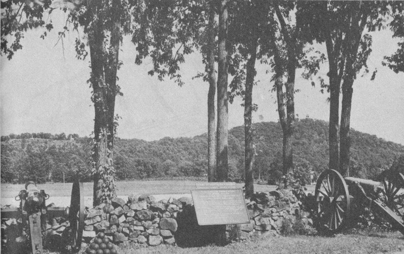 View of Culp’s Hill, taken about 1890, showing earthworks on the crest of the hill. Gettysburg, one-half mile northwest, may be seen through the vista. (Tipton photograph.)