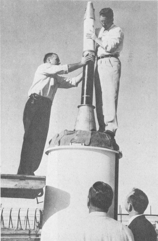 5. Trial firing of a full-size mockup of Explorer 1 on the third-stage assembly of the Jupiter-C launch vehicle.