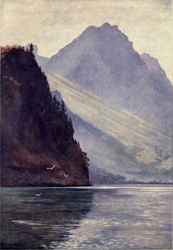And this elusive yet striking quality of beauty is no particular possession of the mere distant view from Brunnen; it is just as evident upon near inspection. From Tellsplatte or from Flüelen, from Isleton or from{52} the Rütli, or from any open spot upon the whole length of the wonderful Axenstrasse, “this temple of wild harmony” has all the charming variety and mystery of lovely woman. The close intimacy of severe and towering crags (as at Sisikon and Isleton) does nothing to dispel it; rather is it accentuated by the presence of something so rudely definite. Whether it be where the bare precipice plunges headlong to the Lake (as at the Teufelsmünster, near Flüelen), or whether it be where the beech woods run down to meet the waters (as at the Rütli and round about the Schillerstein), sublimity, which in part is mystery, is never wanting. Always there are heights, or snows, or distances over which the thin air plays in endless moods of light and shade. The Bay of Uri is indeed a wonder-spot in which to roam and float and dream. Well might the water-sprite in Gerhart Hauptmann’s The Sunken Bell have drawn his inspiration from men and women to be found wandering here entranced; well might these scenes by Uri’s waters have given him the insight to exclaim:—