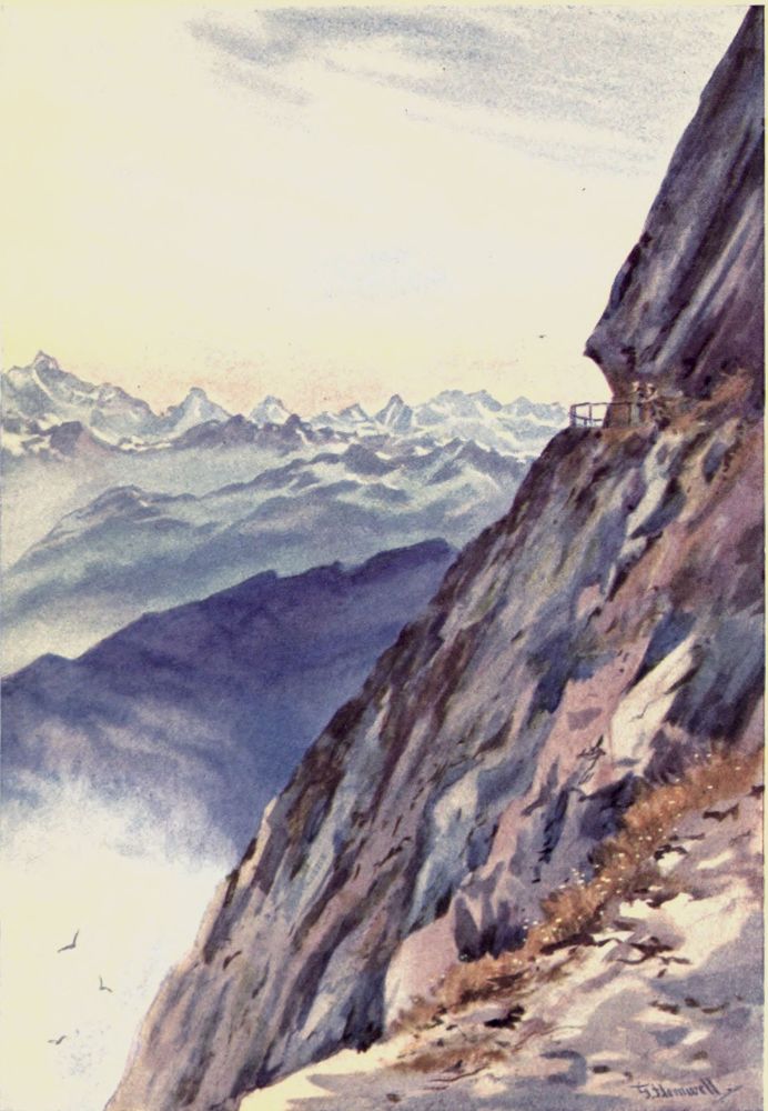 A large part of the superiority of Pilatus over the Rigi lies in its magnificent foreground: invaluable adjunct to the panorama. A vast, unbroken horizon is well for a time, but it is all of a piece, and its very immensity becomes wearisome. Humanity is more at home with partially hidden views. To have everything simultaneously discovered is, for many subtle but important reasons, to impose a limit upon interest. A certain amount of interruption gives durability to pleasure. Delightful combinations are present, and the eye can rest reposefully upon portions which in themselves are perfect pictures. In this manner, then, Pilatus is more attractive than either the Rigi or the Stanserhorn. The panorama itself may be much the{41} same from all three of these eminences, but from Pilatus it is enhanced by the mighty foreground. All about the summit are wild, weird places of fascination, and this was particularly so during those late autumnal days, with the dense, billowy sea of fog below, covering the whole Lake, stretching away over the plain towards the Jura, straggling up the valleys towards Engelberg and the Brünig Pass, and leaving such prominences as the Rigi, the Bürgenstock, and the Stanserhorn like islands floating on a scarcely moving ocean. The huge, abrupt escarpments of Pilatus looked the more impressive for the purple shadows which they threw upon this milk-white sea; and the choughs, circling and whistling about the crags, lent just that eerie note which has been so fruitful of legend in the past.