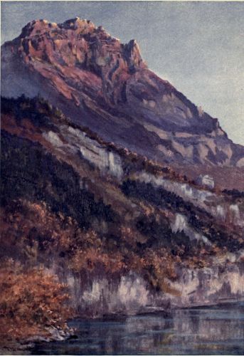 To the south of the Lake of Zug, and lying beneath the precipitous masses of the two Mythen, is the little Lowerz-See with the tiny Isle of Schwanau, seeming like a mere boat upon its surface. This lake, also, has its part in history. King Ludwig of Bavaria, Wagner’s far-sighted if eccentric patron, sojourned for a time upon the Isle of Schwanau; so also did Goethe. But history goes back further than this: back again to the tyrannical Austrian governors, one of whom had his castle on the island. And history (or is it legend?—hereabouts the line is often not well marked between the two) tells of how this Governor “was smitten with the charms of three beautiful but virtuous sisters, living in the neighbourhood of Arth”, and of how these three sisters, to escape his importunities, “fled to the pathless wilds of the Rigi”. Here, near a spring of water, they built themselves “a little hut of bark” and settled down to live, until one summer night some herdsmen noticed “three bright lights hovering over the wooded rocks”, and, following these lights, they reached the little hut where they discovered the three good sisters wrapped in their last long sleep. The spot, near the Rigi-Kaltbad Hotel, is still famous as the Schwesternborn, and its waters are noted for their healing properties.{35}