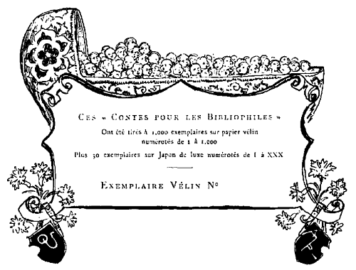 Ce fut il y a cinq ans, il vous en souvient, au cours de la dixième année d'existence de cette lourde revue Le Livre, dont vous étiez devenu sur le tard un précieux collaborateur, que nous échangeâmes, en une heure de répit, certains propos de Bibliofolie amusante groupés en une incohérence voulue, nous plaisant à échafauder un Recueil de Contes de tous les temps et de tous les pays, dont les thèmes divers nous mettaient en chasse d'étrangetés, et nous étions là, sondant le passé, scrutant l'avenir, dressant déjà une table des chapitres, émerveillés nous-mêmes de notre ingéniosité, comme le sont très souvent deux partners sympathiques dont les cerveaux délibérés ou présomptueux se passionnent à l'unisson, s'excitent, s'emballent et arrivent—sans préméditation aucune—à tisser le canevas précieux de quelqu'une de ces productions spontanées qui seraient légères et séduisantes si la température intellectuelle du lendemain ne les assassinait pas en refroidissant le germe dans l'œuf.