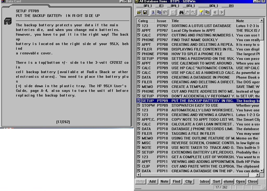 GDBWin is a program for Windows (9x/NT/2000) that lets you access GDB, NDB, and PDB files created on the HP 100/200LX. It doesn't work with Appointment Book or World Time files. The program will let you view and edit information in the database files. It will let you add or delete category words and subsets. However it will not let you create or modify a database. You must create custom databases on the Palmtop (or in CPack) before they can be accessed with GDBWin. As a result the program is of use only to owners of the HP 100/200LX Palmtops.