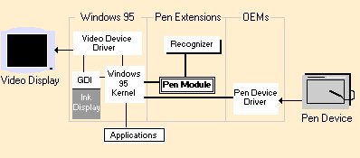 CIC provides the most advanced recognition with HRS. Development tools Developers will notice greatly enhanced support for Pen Services. The API has been updated to be more object oriented, and the APIs are provided in both 16 bit and 32 bit forms. The inking model has been improved to offer applications far more control over the inking process (for example, to implement a highlighter tool) and better performance. A new Ink Edit control provides powerful ink-editing capabilities to applications. The application developer can simply place one of these controls on a form and the control handles the rest. Users can draw, erase, move strokes around, and adjust color and thickness of individual strokes of ink. Because most pen functionality is provided to applications automatically (or encapsulated in controls), applications developers can implement as little or as much pen functionality as they want. The updated Windows 95 User Interface Design Guide offers the most up-to-date references on implementing Pen support. Pen Driver Information For both Pen Services and Pen Extensions, the key to pen input is the pen driver that is the interface from the tablet/digitizer to the pen manager. Both Pen Services and Pen Extensions come with sample drivers.