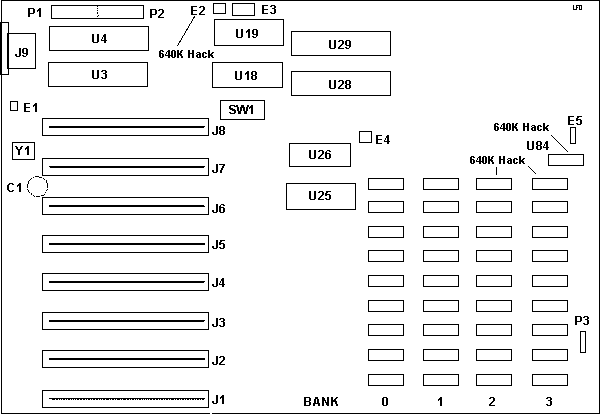 The XT supports 640k and with the addition of one chip 74LS158 in u84 (plug in) and a jumper it will support 640kb on the system board with 2 banks of 256 chips and 2 banks of 64s. Weee! It was still a handy trick for saving slots. You can also plug in a 5162 (286) board with no  modifications. A handy 5155 "luggable" trick