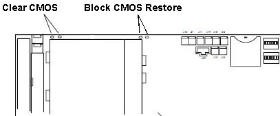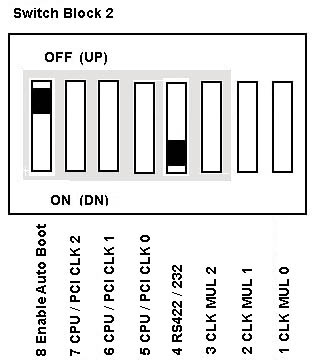The logic on the SBC works as follows: The two connector pins on the SBC are routed to the detector circuitry. When the pins are shorted, an event is latched in the detector. The event is latched even if the computer is turned off or the power cord is unplugged. Bit 6 at I/O address 0158h contains the status of the latch. If bit 6 is 1, the latch has been tripped. The latch is reset by setting bit 6 at I/O address 0157h to 1. To use the logic to detect a cover being removed, the user must connect a switch that is closed when the cover is removed, and open when the cover is installed. Clear Password Removing a Power-on or System Administrator Password: If you need to remove either the power-on or system-administrator password: 1. Turn off the computer and remove the cover. 2. Use a screwdriver or other conductive device to short the two pads on the password clear pad for 10 seconds (refer to the following illustration). An alternative method is to remove the battery for 10 minutes. ![]() 3. Reinstall the cover. 4. Turn on the computer and run the Configuration/Setup Utility program. 5. If a password is required, you must enter a new one. Switch Block 1 ![]() 8 - 3 Reserved Leave these alone. 2 Disable Video Switch 2 on switch block 1 lets you disable the video function on the SBC. When this switch is down (on), the SBC disables all video drivers on the SBC. Default is video enabled (off). Disable Keyboard/Mouse Switch 1 on switch block 1 is used to disable the keyboard and mouse ports, preventing anyone from using the keyboard or mouse. Default position is keyboard and mouse ports enabled (off). Switch Block 2 ![]() 8 Enable Auto Boot Switch 8 on switch block 2 controls the SBC auto-boot feature at power-on. With auto boot enabled, BIOS detects configuration errors at power-on and automatically alters the CMOS settings to match the hardware so that the computer can complete the boot process without operator intervention. This is useful where an operator or keyboard and display are not available to clear the configuration error. Use this carefully because it can mask hardware problems. Hardware errors could cause the computer to change configuration and possibly lead to inconsistencies in the operation of hardware and applications running on the computer. Default position is auto boot disabled (off). 4 RS-422/485 or RS-232 Switch 4 on switch block 2 controls the electrical interface of serial port B. If the switch is up (off), the port is a standard RS-422/485 interface. If the switch is down (on), the port is a standard RS-232 interface. The default position is RS-232 (on). Processor Speed Selection Switches Switch block 2 is used to configure the SBC to the speed of the microprocessor. Switches 1 through 3 select the internal clock multiplier for the microprocessor. Switches 5 through 7 select the input frequency and external bus speed. The following table shows the settings for the clock multiplier and the resulting internal processor clock for each CPU-input frequencies.