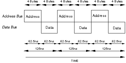 Basic Matched Memory Matched Memory w/o Wait Streaming Data Transfers 32 or 16 bit Streaming 64-bit Streaming 64-bit Streaming w/50ns Cycle Basic Data Transfer Cycle The basic transfer cycle works by first defining the address (in memory or I/O space) where a transfer is to occur, and then, in a second operation of equal length actually transferring the data. Each half of the operation (defining the address and data transfer) takes 100ns, or 200ns total. This process is repeated until the entire block of data has been transferred. Micro Channel - Basic Data Transfer (20MBps) shows basic data transfer in operation. Basic data transfer on the Micro Channel runs at 20MBps (each cycle takes 200 nanoseconds, and 32 bits or 4 bytes of data are transferred at a time). Five such “default” cycles can be performed in a millionth of a second. Each cycle moves four or two bytes per transfer, yielding a data transfer rate of 20MB/sec for 32-bit (4 byte) transfers or 10MB/s for 16-bit (2 byte) transfers. Basic Data Transfer 20MB/sec for